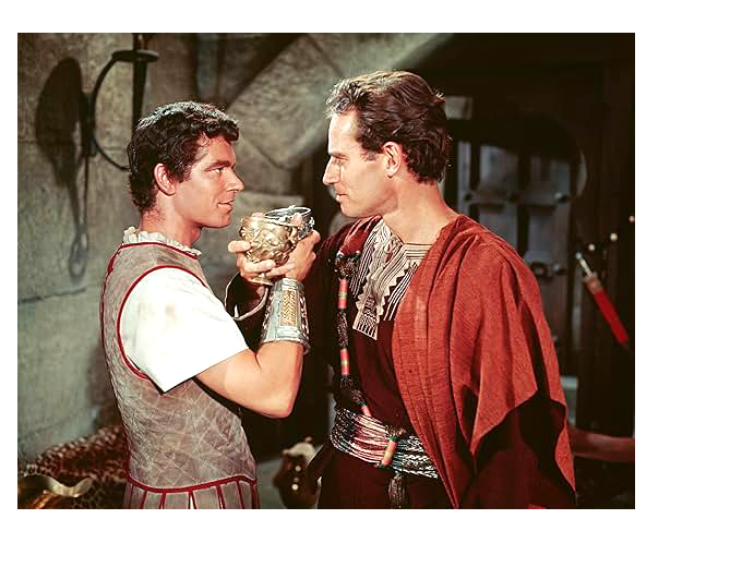 We can tell that for most shots it’s actually Heston and Boyd out there clashing, racing at speed. No matter what ‘cheating’ was going on, it’s clear that the two actors were in the thick of it. The horse action never looks sped-up and the stunts are particularly gory. If Heston or Boyd were to fall, they could easily be injured by the teams of horses running directly behind. We feel the it’s-really-happening physical immediacy of the chariot race. It’s a sensation that the movies have lost. Insert generic anti-CGI rant here.
