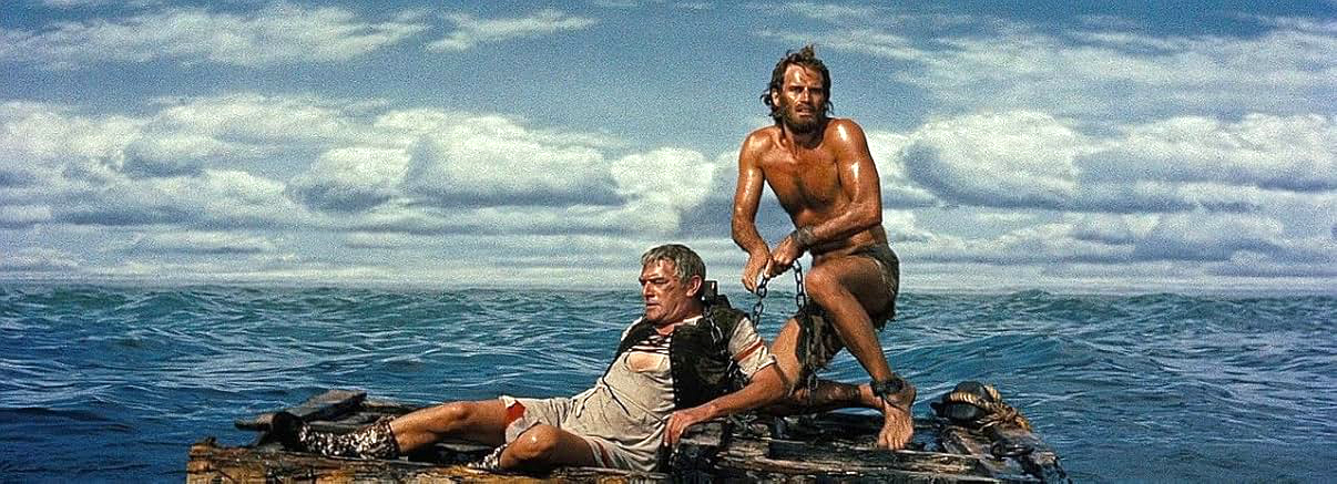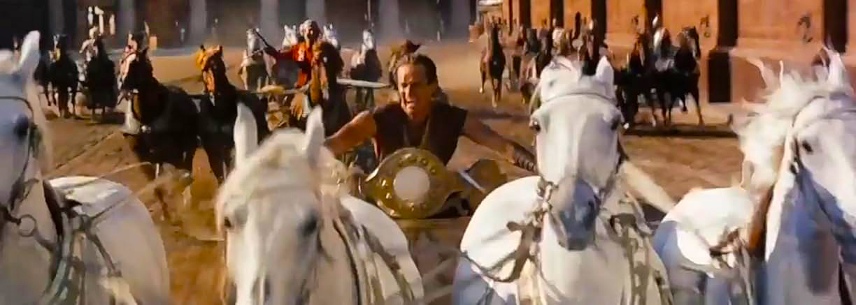We caught our share of reserved-seat Road Show screenings in our time, but William Wyler’s spectacular epic was not one of them. Catching up with Ben-Hur happened on a VHS tape on a 24-inch TV screen. Previously all I’d seen were excerpts on Johnny Carson’s The Tonight Show: every few years Charlton Heston would show up to screen a clip of the chariot race (Johnny loved it) and make jokes about parting the Red Sea. Heston said that many fans acted like he was a close relation of God.