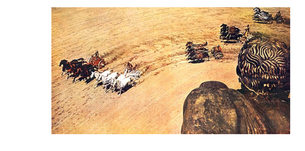 That race comes early in the second half of Ben-Hur. By that time we’ve already been knocked out by an exciting naval battle with Roman Tiremes, achieved through elaborate model work and traveling matte effects. The chariot race is achieved through live-action filming by second unit director Andrew Marton and the legendary stunt whiz Yakima Canutt.