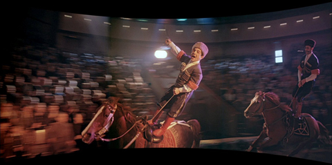 We’re told that Cinerama’s Russian Adventure debuted so late (1966) that only one theater in Chicago actually showed it in real Cinerama; elsewhere it was printed down to normal 70mm. It’s a great show, among the most entertaining of all the 3-panel movies. Hal Dennis was able to pull sequences from six different Russian movies, which gave him more variety to choose from: note the six directors listed above. The show has plenty of material that turns the movie into a rollercoaster experience, but there’s also a wide range of subject matter. Those Russian directors are also more adventurous in their use of the camera.