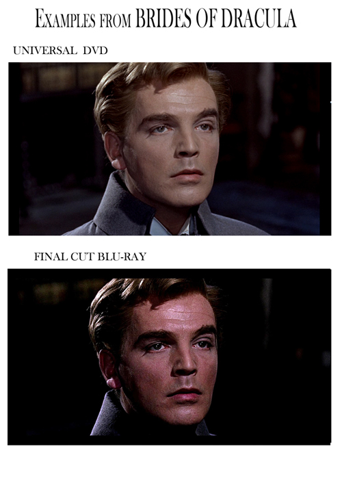 Years ago Universal released a fantastic Hammer Films DVD set. It contained a knockout version of The Brides of Dracula, presented at 1:66:1 and with great color. The film had its Blu-ray debut in England in 2013 via the Final Cut Entertainment label, and it was a disappointing head-scratcher. It should be noted that labels such as Final Cut very often license a title and are provided a master from the licensee on a “take it or leave it” basis. Whether or not this is the case here, their Blu-ray is sourced from a transfer inferior to the one used for the DVD (which was destroyed in the Universal Studios fire in 2008). The Blu-ray is presented at an aspect ratio of 2:00:1. Reasonable arguments can be made for Hammers from the early sixties being correctly matted at either 1:66 (European standard) or the slightly tighter 1:85 (U.S. standard). But where does this odd variant come from? It was probably never screened like this, at least not intentionally. The cropping simply cuts out too much picture information. Hopefully if Universal releases or licenses it here in the U.S. for Blu-ray it will return to the handsome 1:66 look of their DVD.