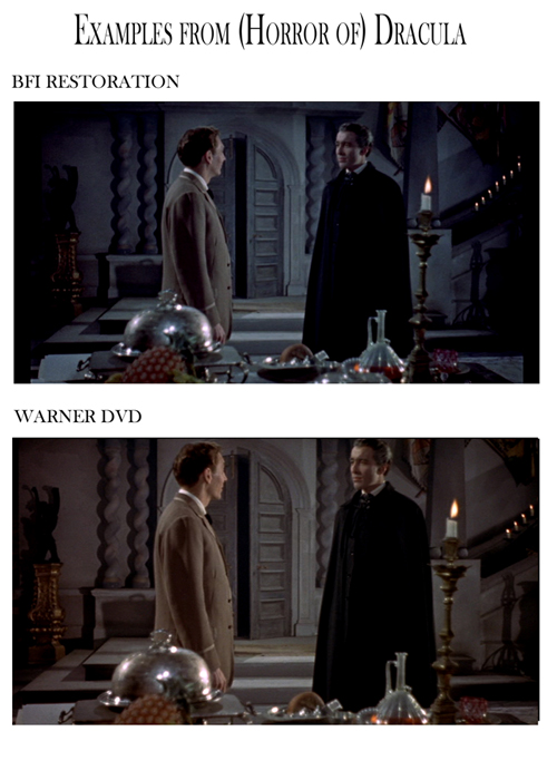 You’d be surprised how many telecine people and video experts have no special interest in movies. But technical experts can be Hammer fans too, and I’m always asking this one about the strange way the UK releases are being transferred. So for Halloween, and to go with the new Warner’s Hammer Blu-ray release, I asked him to do what I can’t do: review the quality of these Region B releases that only a few fans get to see. My unnamed friend has most of them. He’s more lenient than I am about the odd revisions we’ve seen. Just remember that the titles with the fewest comments are the ones without problems. When he says, “it gets by,” he’s really saying, “It’s great.” — Glenn Erickson, 10.11.15)