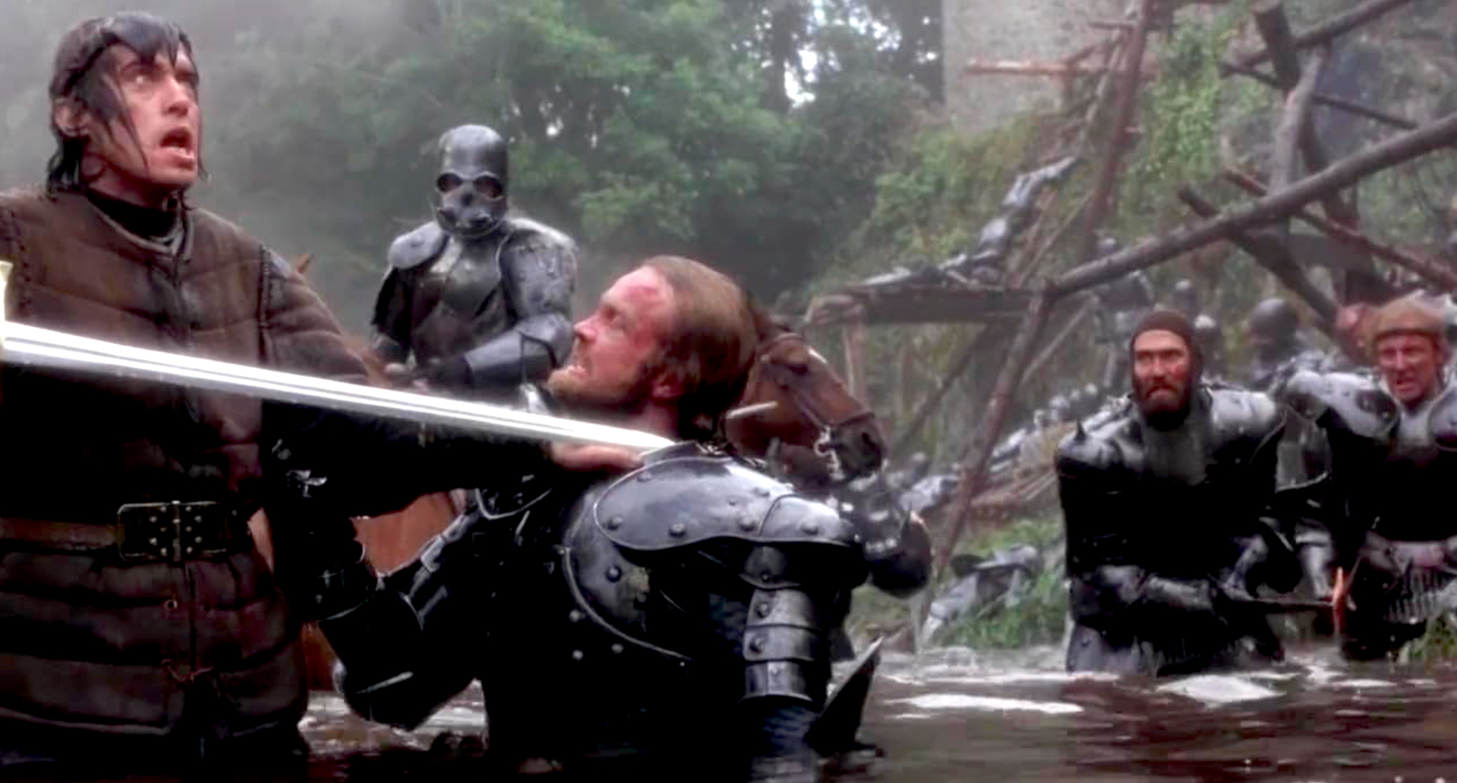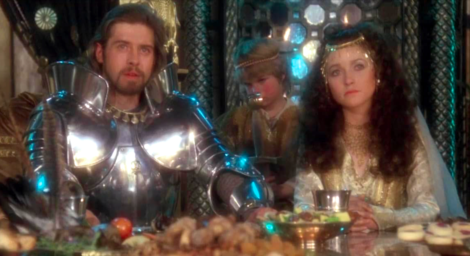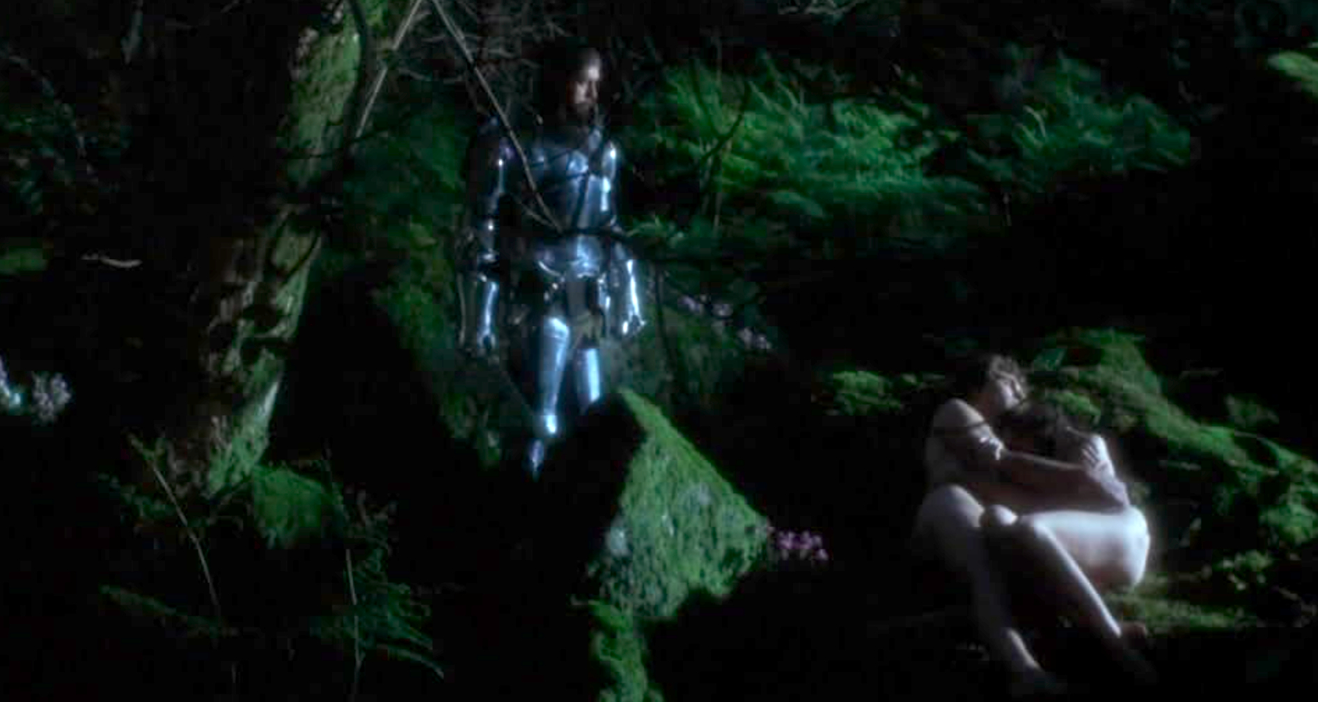This interpretation takes the form of a multi-generational epic. Druid wizard Merlin (Nicol Williamson) helps warlord Uther Pendragon (Gabriel Byrne, in nearly his first movie) obtain the sword of power Excalibur, which he uses to unite a pre-England island of tribes. But Uther ruins everything by using Merlin’s magic to seduce another man’s wife. The magical sword ends up plunged into a stone. Many knights try and fail to pull it out, and none become the new King. Against all reason, young squire Arthur (Nigel Terry) pulls the sword out — he is the Chosen One. After a pep talk from Merlin, Arthur accepts his destiny, using both might and mercy to unite the tribes once again. He now “is” England, as the king’s health and the welfare of the land are one. He assembles a group of virtuous knights to found a glorious new rule of honor and justice. He weds Guinevere (Cherie Lunghi), the daughter of the loyal noble Leondegrance (Patrick Stewart). But Arthur’s idyllic reign begins to crumble. Guinevere and Lancelot (Nicholas Clay), Arthur’s champion of the Round Table, become irresistibly attracted to one another. Their betrayal of Arthur is as fated as the other ‘human’ weaknesses that ruin Merlin’s hopes.