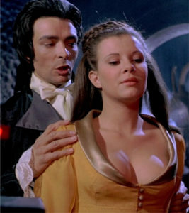 The sisters play nice and naughty versions of themselves—Mary is the shy wallflower while good-time girl Madeleine haunts the castle of a local degenerate who also happens to be a vampire. Peter Cushing plays the twins’ uncle, the puritanical Gustav Weil, a kissing cousin to Vincent Price’s Matthew Hopkins of Witchfinder General. But unlike Hopkins, Weil is no religious hypocrite—he’s ready to behead his niece in order to save her soul. Still burdened by the death of his wife Helen in January of that year, Cushing seems ravaged—pale and out of sorts, his performance as the tormented Weil is too close to home to be truly enjoyable.