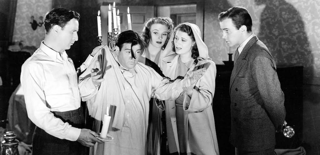 Left to right: Bud Abbott, Lou Costello, Evelyn Ankers, Joan Davis and Richard Carlson in HOLD THAT GHOST (1941), directed by Arthur Lubin.