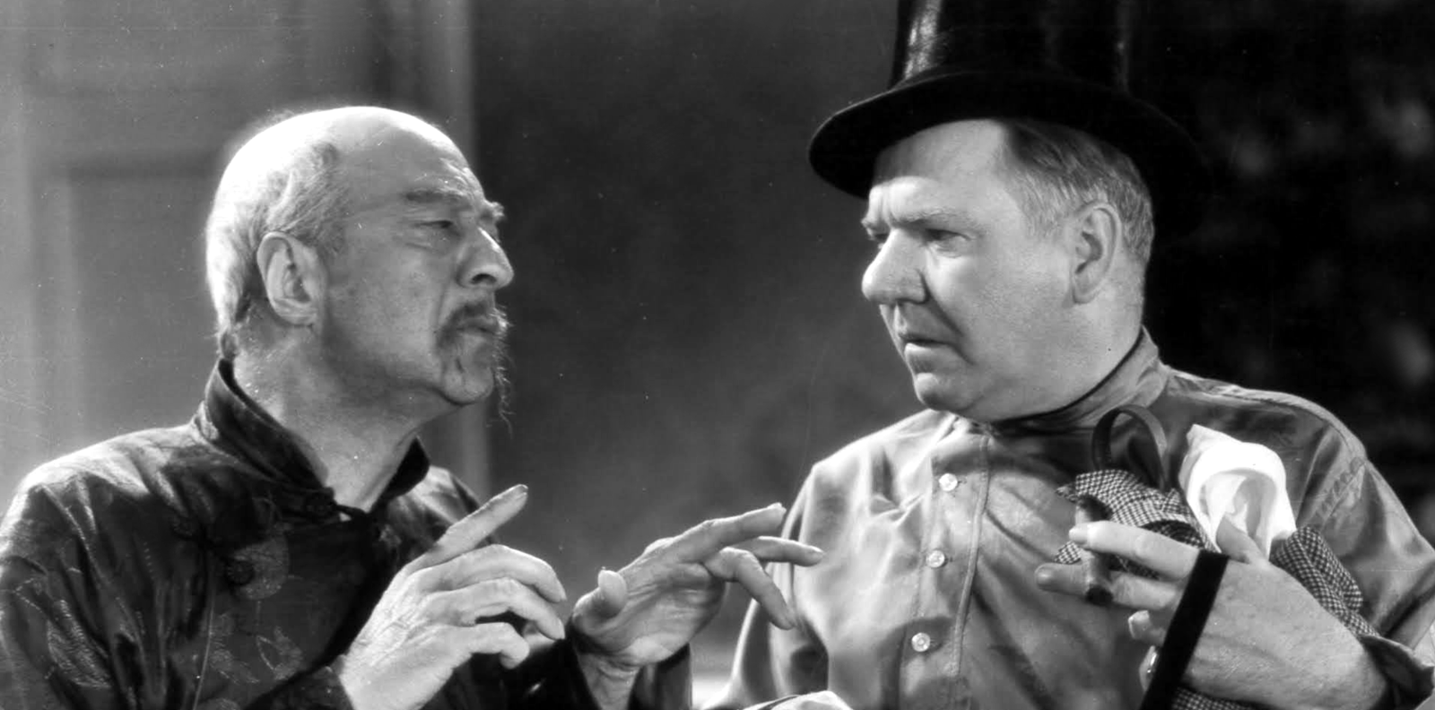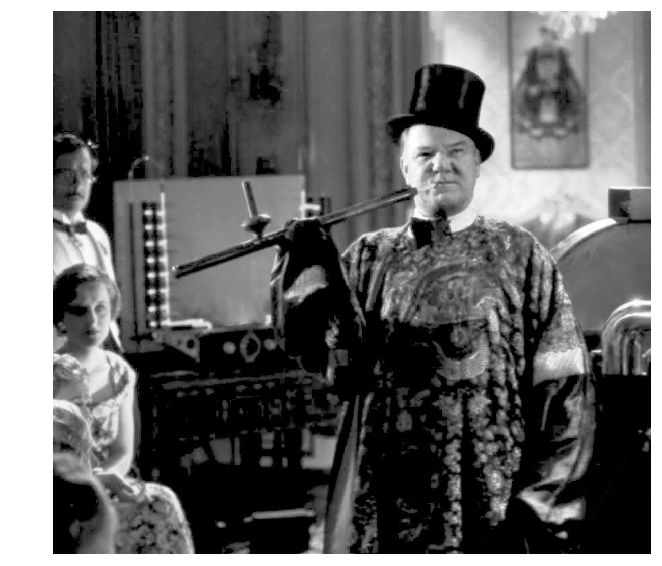 The proceedings are interrupted by Professor Henry Quail (W.C. Fields). Circling the world in his autogyro, the crazy alcoholic mistakes Wu-Hu for Kansas City, Missouri. He enters by landing his daffy plane in the middle of the Hotel’s rooftop garden restaurant, much to the concern of the Hotel Manager (Franklin Pangborn). Quail barges off his plane, insults the other guests and monopolizes the booze; he gags when he accidentally takes a sip of water. Dr. Wong mistakes Quail for the American bidder for the invention. Quail moves into the hotel, puffing on an opium pipe in between drinks. His autogyro carries a tiny clown car, which Quail proceeds to drive through the halls of the hotel.