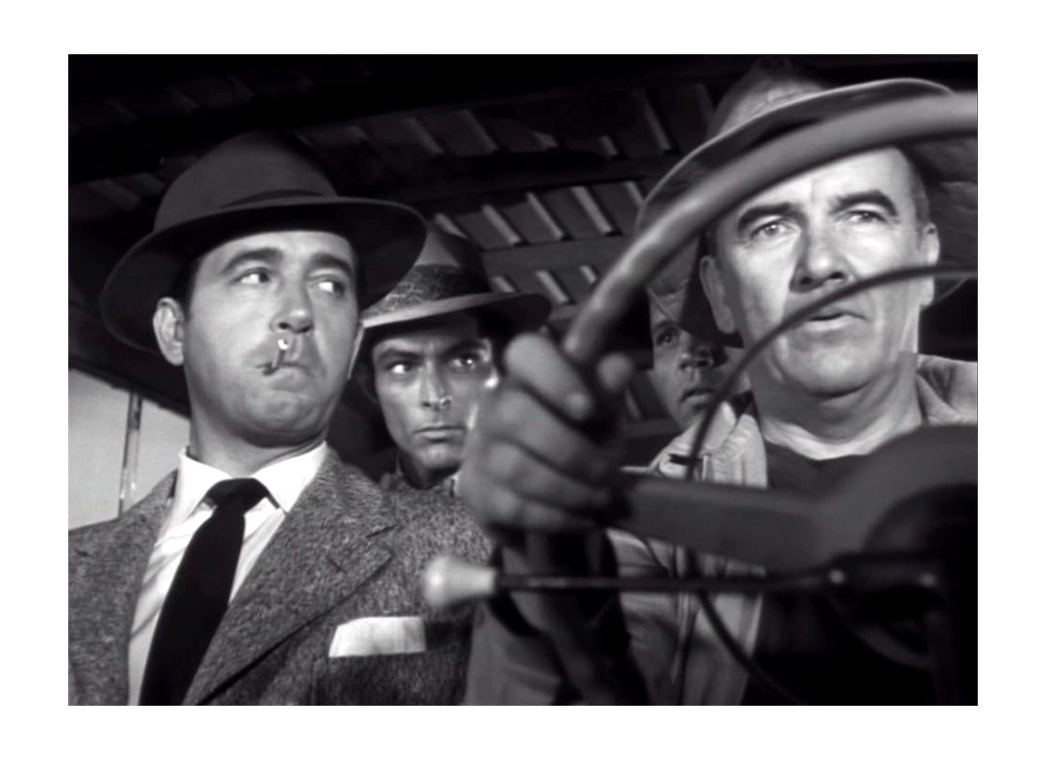 Phil Karlson copes with his limited resources by concentrating on his characters’ interesting faces. Already established as second-string baddies in westerns, Jack Elam (← ), Lee Van Cleef and Neville Brand all have strong roles as shifty crooks. Elam’s neurotic loser is nervous and strung-out. It’s the first film that fully exploits his lazy eye in full close-up. Van Cleef’s oily and boastful lothario likes to hang out with pretty Mexican hostess Teresa (Dona Drake of Another Part of the Forest). Neville Brand’s gravel-voiced thug is tough but dependable. He’s the most sympathetic of the three crooks, all of whom know that the operation’s ‘Mr. Big’ holds all the cards. The ‘no identities’ scheme prevents some of the usual double crosses from taking place.