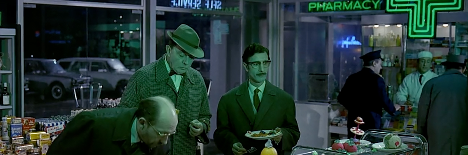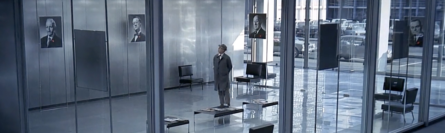 The film began production in September of 1964 with the construction of “Tativille,” a Godzilla of a set that took up the whole of a city block in Saint-Maurice (perhaps most famous as home to the Charenton psychiatric hospital where The Persecution and Assassination of Jean-Paul Marat as Performed by the Inmates of Charenton Under the Direction of the Marquis de Sade was set). The structure both embodies and satirizes the guiding principle of  the Swiss-French architect Le Corbusier: “A house is a machine for living in.” Shooting of the film proper began in April of 1965 and lasted till October of 1966 due to bad weather and bad luck (Tati, Ala Welles, was continuously raising money throughout the production).