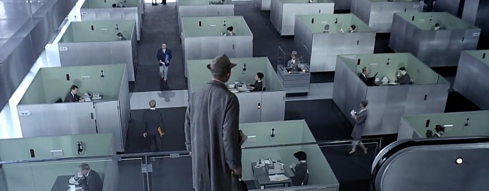 Tati and his many crews spent three years building PlayTime’s set, a steel and glass mousetrap/hamster wheel for the characters to play, work, and suffer in—as an actor Tati assumed the role of his beloved character Hulot, a shy, pipe-smoking pilgrim, as the director he assumed the role of God like so many mad scientists have done before him, from Frankenstein to Dr. Mabuse (plus Hitchcock, Welles, and a score of other filmmakers).