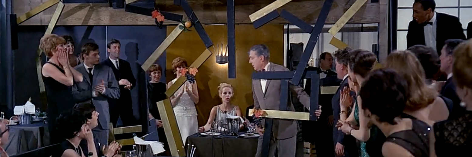 The movie opens with a vision of Tativille and what an imposing, beautifully sinister sight it is; the architecture is representative of Le Corbusier’s “International Style” with “glass curtain” walls that make the facade come alive, and not in a good way. To add to the unease, the kindly Hulot only appears sporadically, it’s left to his audience to take over for the Frenchman and they pay the price—from the opening frames we’re thrown into the midst of a multi-level beehive along with a boatload of frantic humans, a widescreen Tower of Babel.