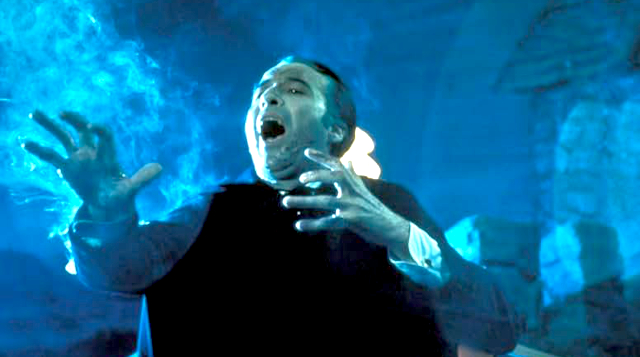 One visual effect at the finale is very good. Dracula had earlier used a knife to slay his own bride; here he threatens Simon with a sword pulled from a charcoal fire. The glowing red blade is so good, we don’t think it’s an optical or an electric sword. We’re guessing that it’s a front projection trick, with the new 3-M front projection screen material sprayed directly on the sword’s blade.