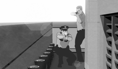 I’ve thought the use of roto-scoped live action was a cheat ever since the days of Ralph Bakshi. In the pictures A Waking Life and A Scanner Darkly I just didn’t see the point — why were we not just watching the underlying images? In Tower, using live action would essentially recreate The Deadly Tower, making the show look like yet another police thriller where men with guns must react to an unexpected situation, with actors playing heroes rescuing people. It might as well be a western drama. The animation eliminates the ‘ego content’: the actors trying to make an impression, the issue of production values (how did they get permission to film?) and all the commercial hoodoo that ends up packaging real-life events as yet another commercial product. In this docudrama, extreme stylization brings us closer to the subject at hand.
