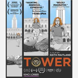 The Kino Lorber Blu-ray of Tower is an excellent encoding of this show, that has made a vociferous fan of most everyone who has seen it. The color is excellent. Director Maitland has pulled off quite a coup, as much of his animated film was based on images recorded on an iPhone. The use of the existing news film is masterful. He concentrates on his core stories, and never do we feel that he’s at a loss for an appropriate image. Real views of the quad with Claire, Tom and Rita lying on the concrete show us just enough to be bitten by the reality of the situation — we can see Claire’s pregnant shape just like the witnesses say they can.